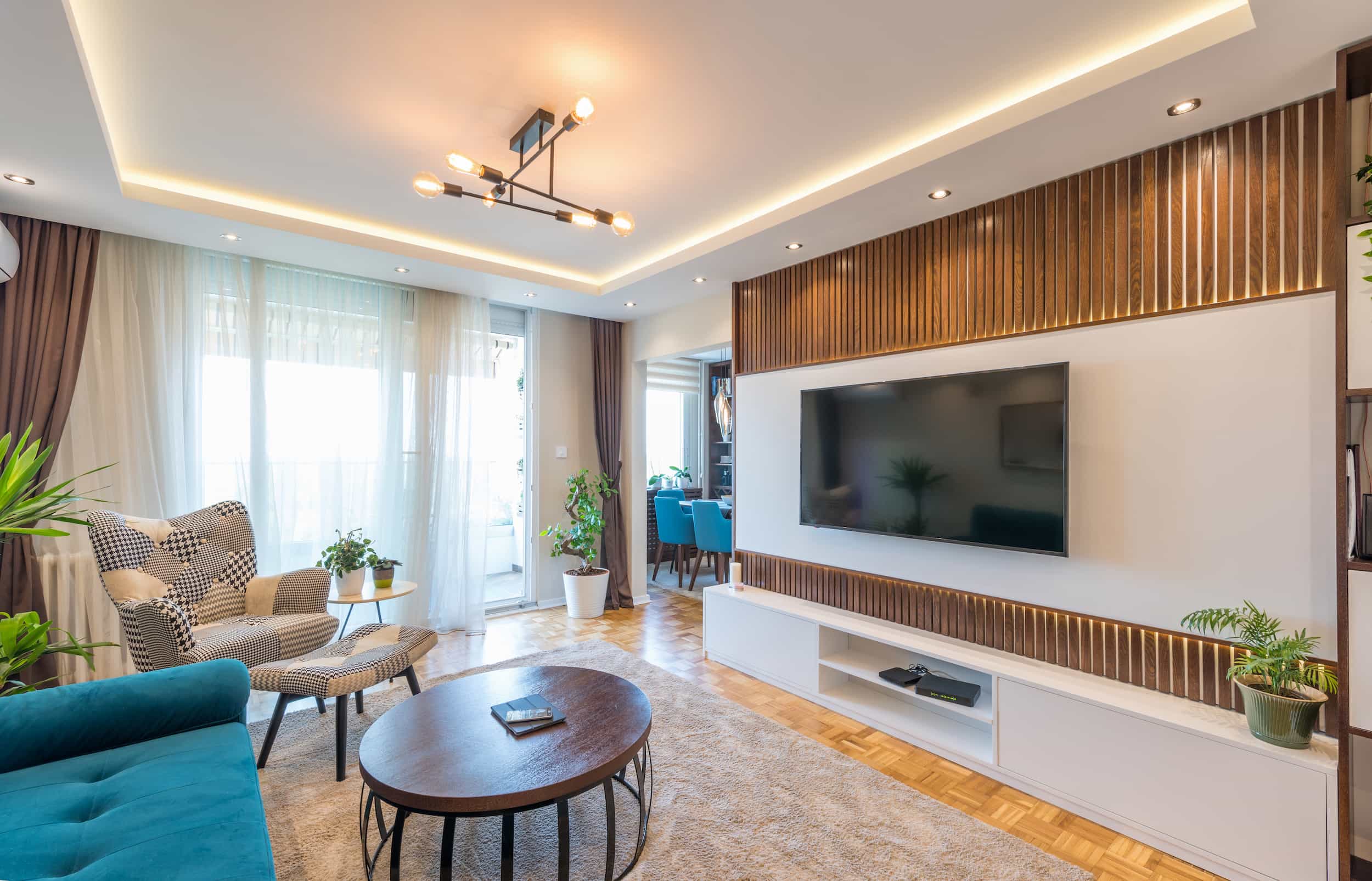 Feature TV walls often include shelving, cupboards, and lighting to create a modern focal point within the space. Cable management can be concealed within the framework, resulting in a clean and organised appearance.